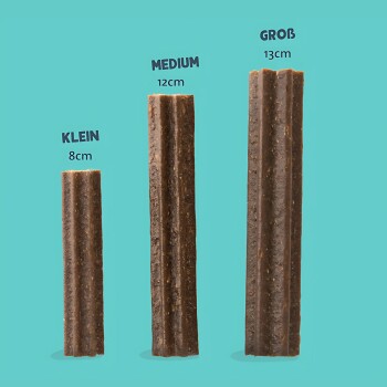 - Starke Zähne sind gesunde Zähne, deshalb fügen wir unseren Sticks Kalzium hinzu, um das Gebiss Ihres Hundes stark zu halten.