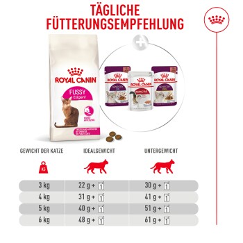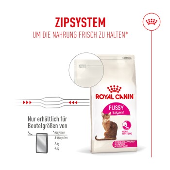 Um wählerischen Katzen Mahlzeiten mit maximalem Geschmack zu bieten, kombiniert die Fussy-Rezeptur unsere 3 früheren Exigent-Rezepturen – Savour, Aroma und Protein – in einem Produkt: ROYAL CANIN® Fussy.