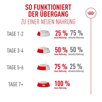 Die Umstellung Ihrer Katze von einer Nahrung auf eine andere sollte langsam und schrittweise über einen Zeitraum von 7 bis 10 Tagen erfolgen. Bitte beachten Sie die Fütterungshinweise auf der Packung, um die richtige Rationierung sicherzustellen.