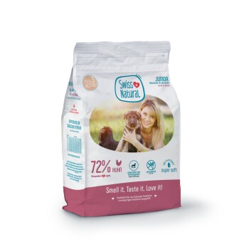 Swiss Natural Soft JUNIOR est un aliment complet de haute qualité, sans céréales avec 72% de poulet de Suisse. Grâce à notre processus de fabrication doux SOFT, jusqu'à 30% d'humidité résiduelle reste dans les morceaux d'aliments. Avec la monoprotéine et ImmunoCell3aktiv, cet aliment représente une tolérance optimale.
